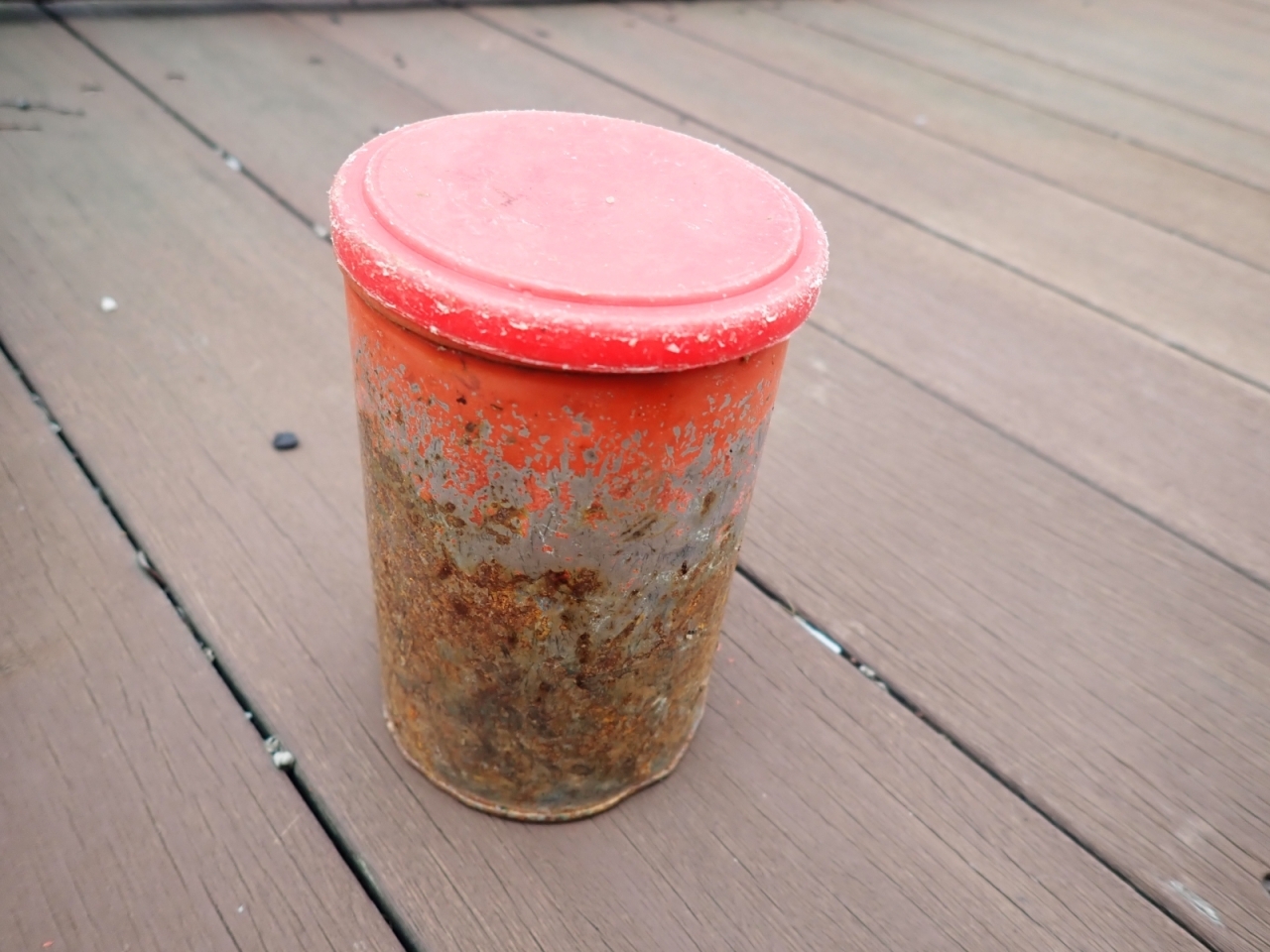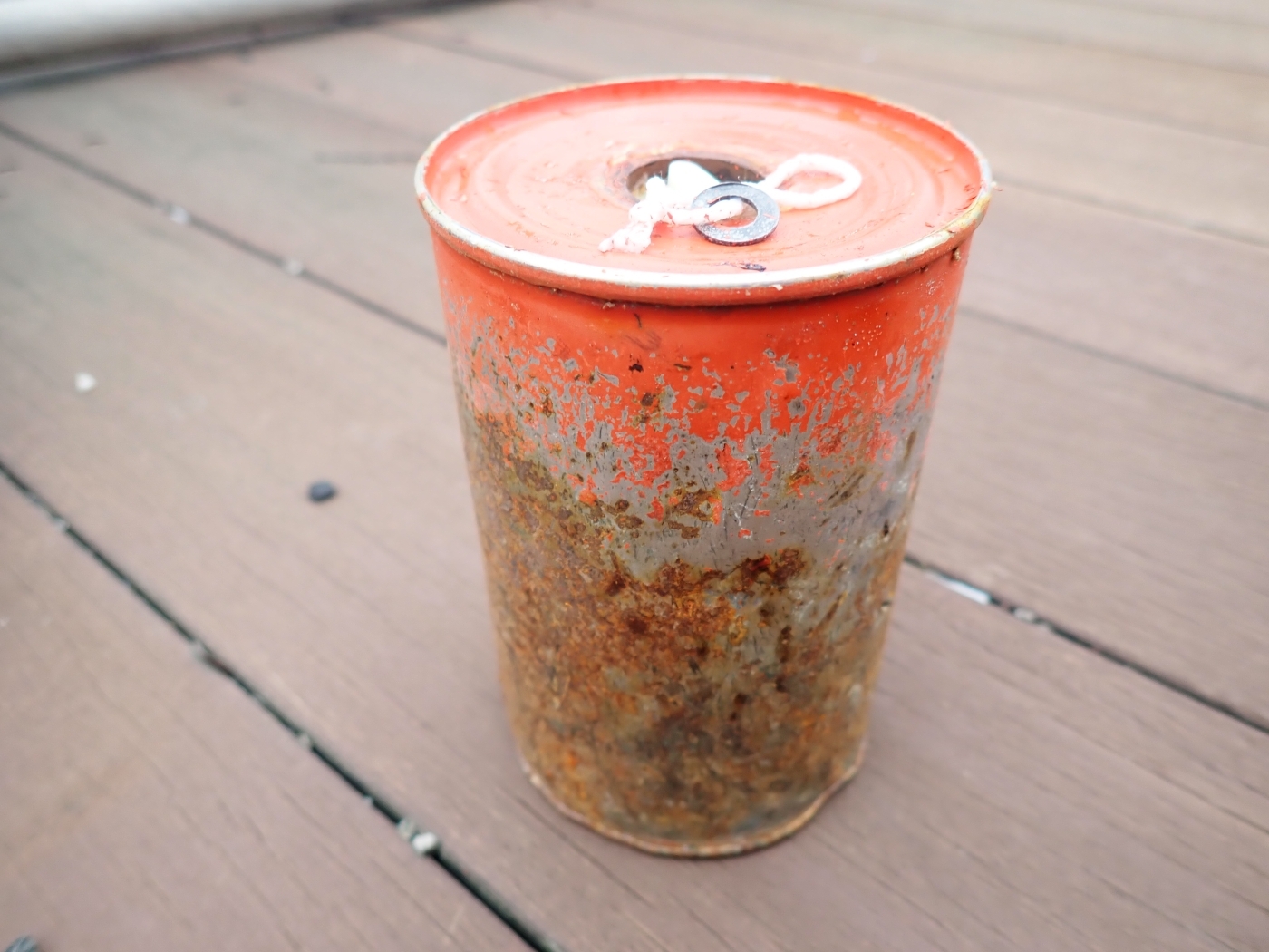 (塗装の剥げた缶の漂着物) (蓋を開けると紐が)