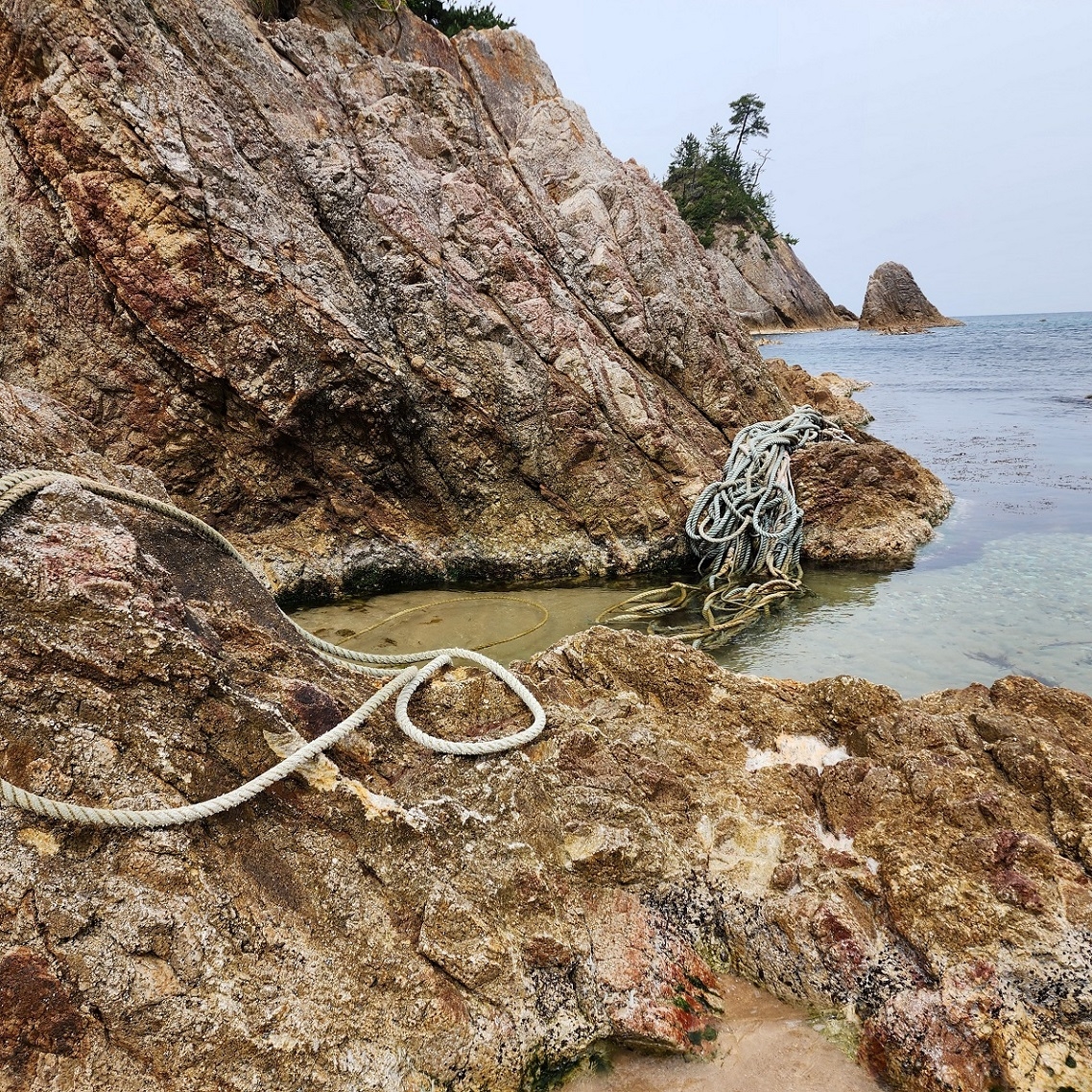 大鴨ヶ磯に漂着したロープ(島の両側から撮影、ロープは繋がっています)