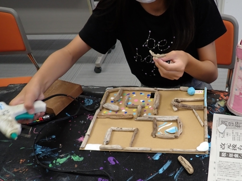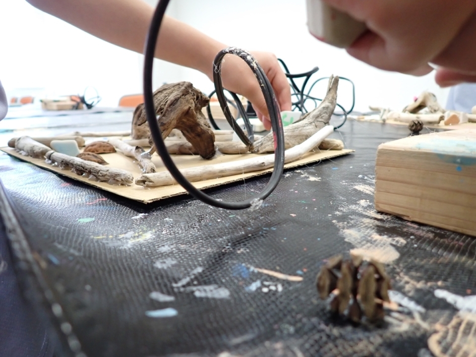 まずは台紙の上に流木で道を作ります。流木は色々な形をしているのでトンネルを作ったり、橋を作ったり皆色々と考えていました。
