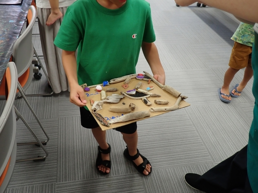 「ここが簡単だから流木をこうしたら」と、お友達からアドバイスをもらったりと、時間目一杯使ってもアイデアは止まることなく・・・。納得いくまでくっつけて、塗って、それぞれ個性的な作品が仕上がりました。皆満足そうでしたのでこちらも嬉しくなりました。