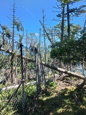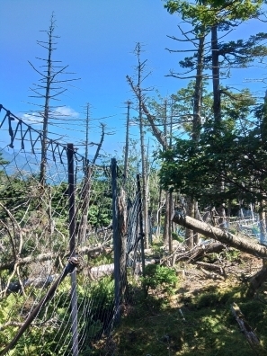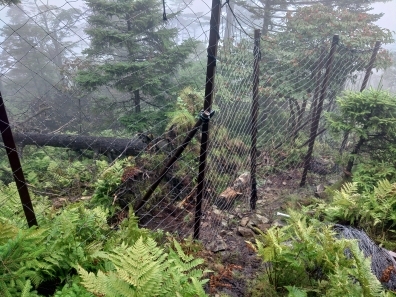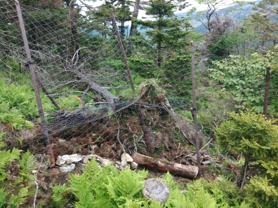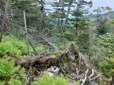 倒木により根が浮き上がり、その影響で防鹿柵のネット下部に隙間ができていました。