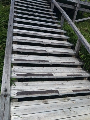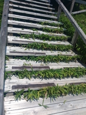 木製階段の隙間から笹が張り出し歩行の支障となるため、大台ヶ原パークボランティアの会の方と除去作業を行いました。