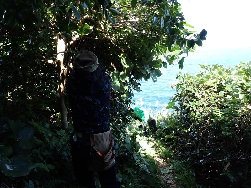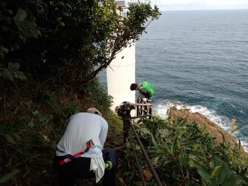 先日、パークボランティアで竹野の猫崎半島にある自然歩道の草刈り作業を行いました。猫崎半島中央部には標高141mの賀嶋山があり、半島先端部にある猫埼灯台まで自然歩道が整備されています。今回はこの灯台付近の歩道の草刈りと道迷い防止ロープの張り直しをメインに活動を行いました。