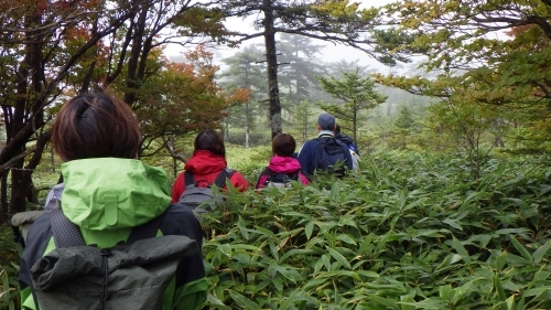 そしてこちらが10月のイベント時の写真です。同じ防鹿柵の入り口を入ってすぐのところですが、ササが人の肩くらいの高さまで伸び、約20年間の成長ぶりがよくわかりますね。