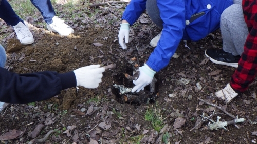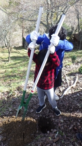 まず、桜の木の近くにダブルスコップで50㎝くらいの穴を掘って・・・