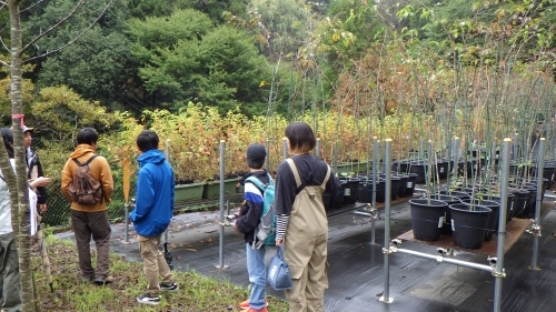 育成園では、枝が折れた桜の苗木に、桜を弱らせてしまう菌の侵入を防ぐための墨汁を塗る作業を体験しました。