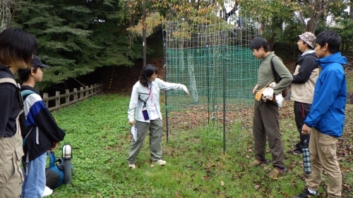 そして、育成園で育った苗木は山に植えられ、↓の写真のような厳重なシカ除けの柵に守られて大きくなります。