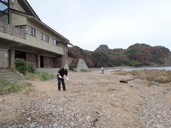 (センター前の浜の様子) (石ころが混じり回収に手間取ります)