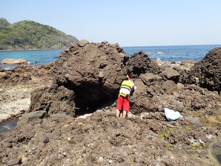 当日はカヌーを使って陸からは行けない岩場の清掃を行う班と、陸から歩いて行ける岩場の清掃を行う2班に分かれて岩場に溜まっているゴミを回収しました。岩場全体を遠目から見るとゴミがあるようには見えませんが、冬の間に流れ着いたゴミは、波によって岩の裏側に溜まっていたり、岩の隙間にガッチリと挟まっています。拾えるペットボトルやビニール、缶やプラスチックゴミは袋に詰め、岩に挟まっている漁網やロープなどは、冷凍包丁やノコギリなどを使って取れる部分のみを回収していきます。