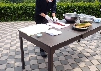 神事の後にはイカの入った水槽を積んだトラックから活きのいいイカが運ばれてきました。イカの活造りの実演です。墨を飛ばすことがあるとのことで、少し距離をとって見学しました。板前さんの話しながらの素早い包丁さばきに思わず「ほぉ~~~っ」と感嘆の声があがります。