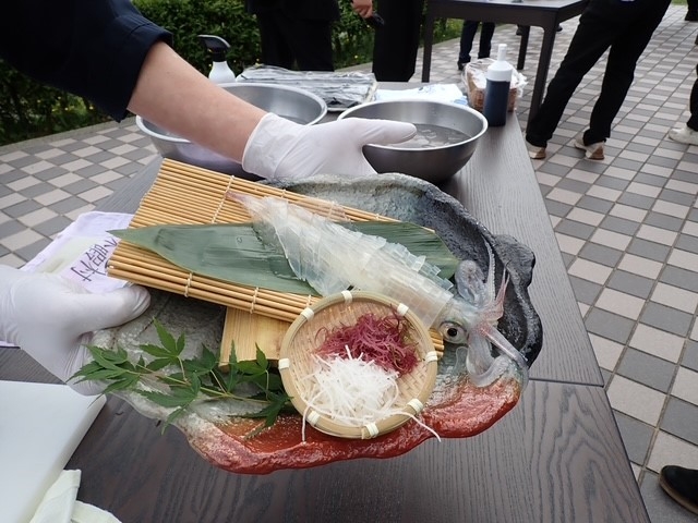 とても綺麗で透明な身をした新鮮なイカの活造りは、参列した方々にふるまわれ、あちらこちらから「おいしい!」の声があがっていました。