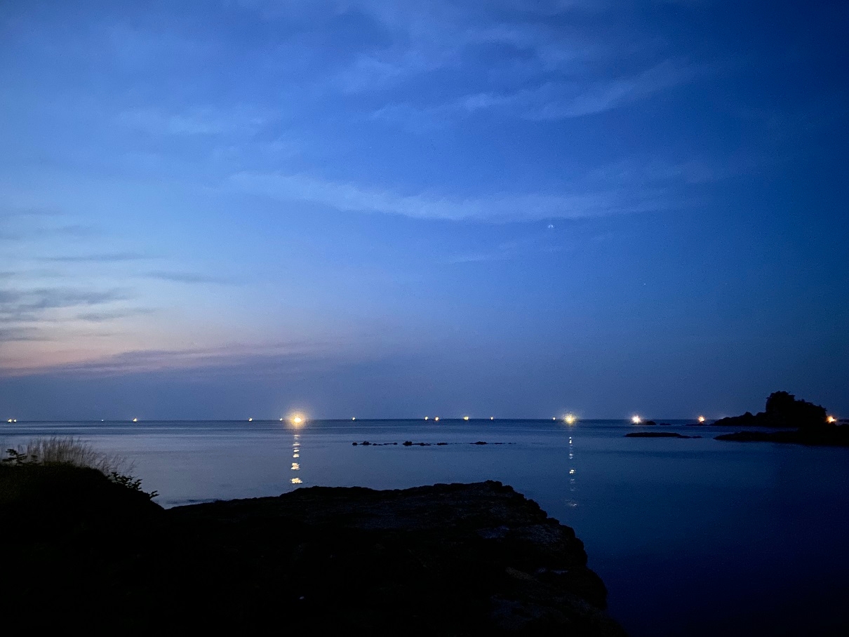 山陰ではこの季節、イカ釣り漁船の明かりが真っ暗な海に灯ります。