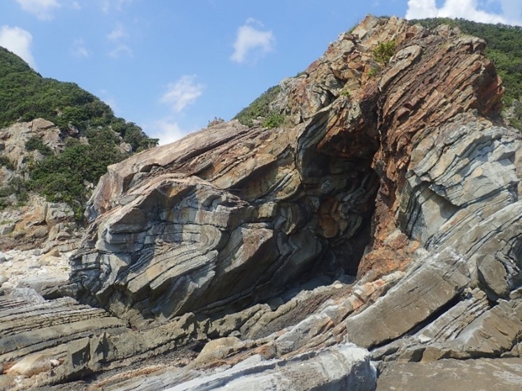 この褶曲は、かつての海溝に堆積した牟婁層群の砂岩泥岩互層が海洋プレートの沈み込みによって付加体となる時に形成されました。砂岩層が完全に固まる前に陸側に押し付けられ折りたたまれたものです。地層は全体として上下が逆さまになっています。世界的にも有名な褶曲で、中学校の理科の教科書にも採用されています。