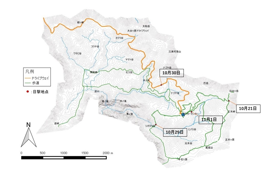 大台ヶ原地区におけるツキノワグマ出没情報(令和7年11月01日現在)